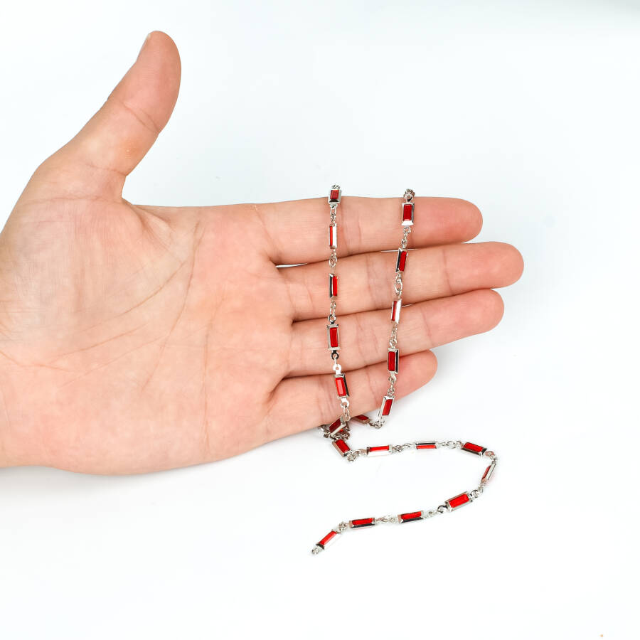 KIRMIZI TAŞLI ZİNCİR, PİRİNÇ MALZEME, RODYUM KAPLAMA
