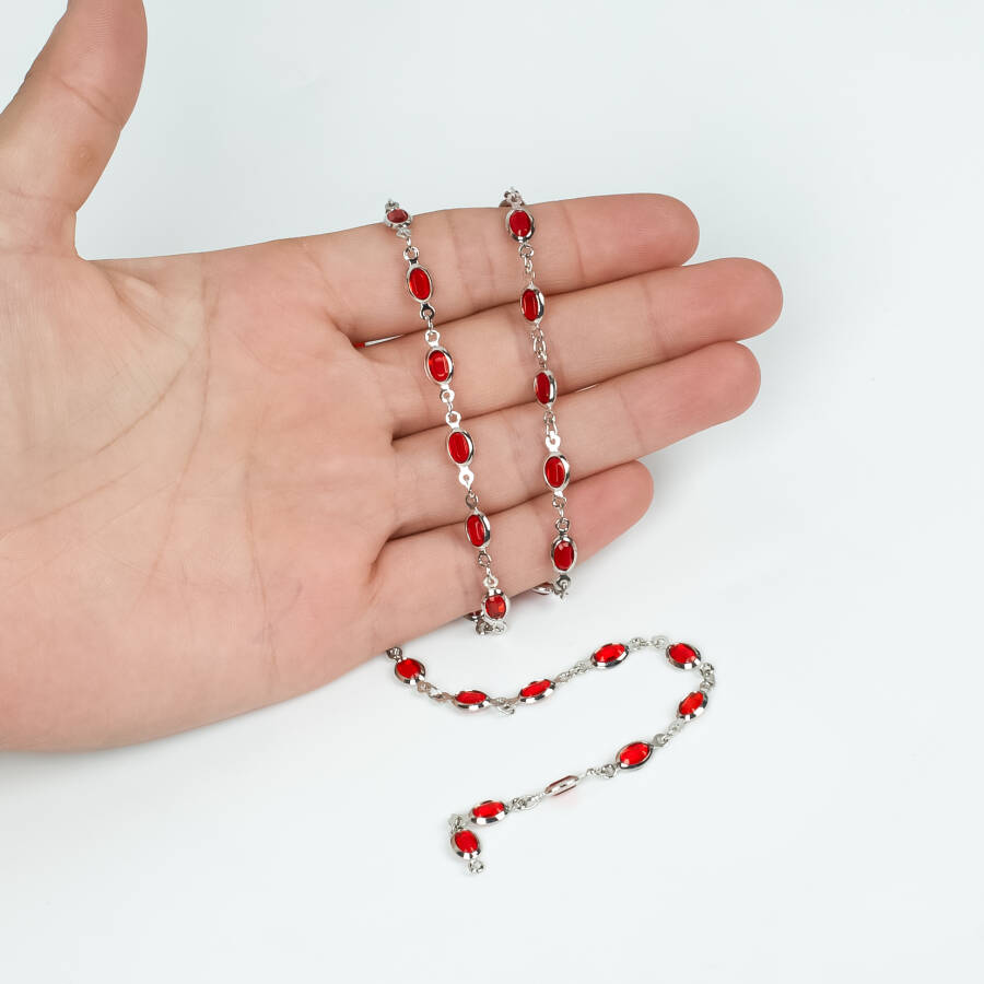 KIRMIZI TAŞLI ZİNCİR, PİRİNÇ MALZEME, RODYUM KAPLAMA