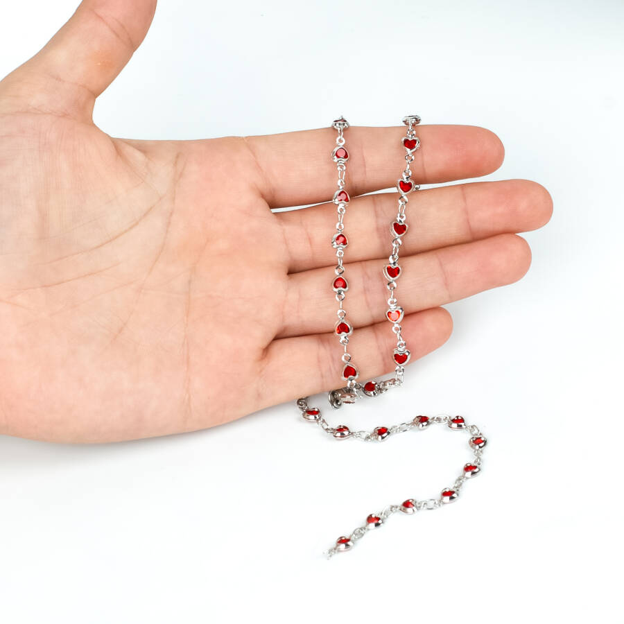 KIRMIZI TAŞLI ZİNCİR, PİRİNÇ MALZEME, RODYUM KAPLAMA