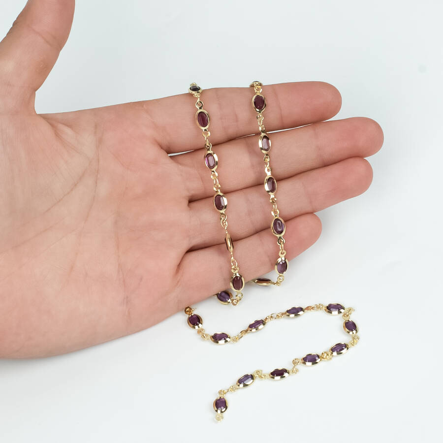 MOR TAŞLI ZİNCİR, PİRİNÇ MALZEME, ALTIN KAPLAMA