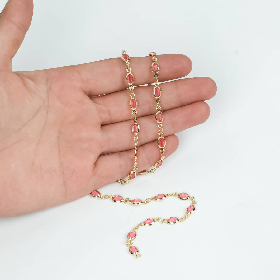 KIRMIZI TAŞLI ZİNCİR, PİRİNÇ MALZEME, ALTIN KAPLAMA