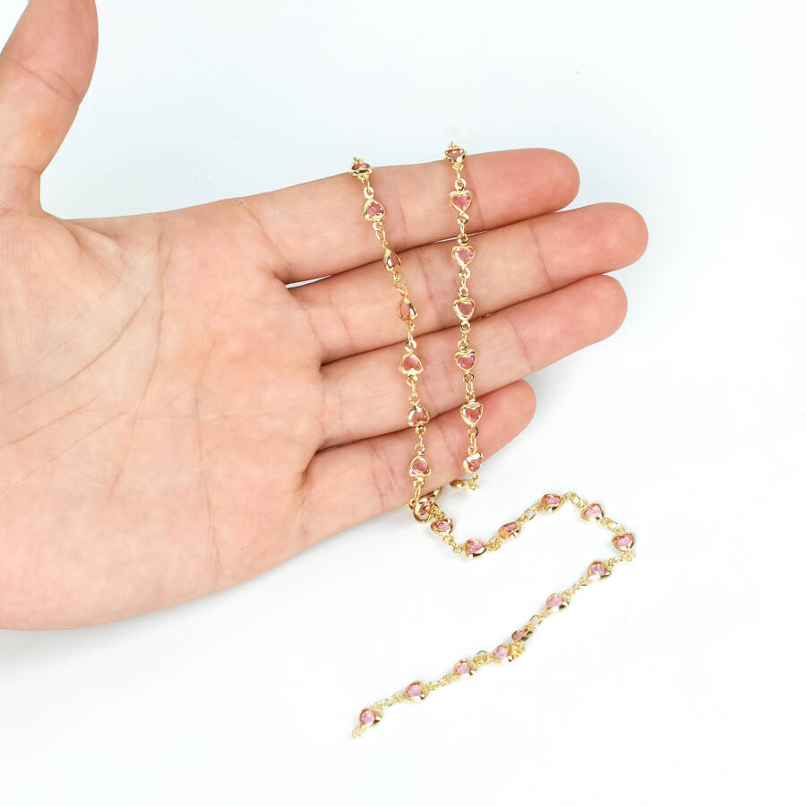 PEMBE TAŞLI ZİNCİR, PİRİNÇ MALZEME, ALTIN KAPLAMA