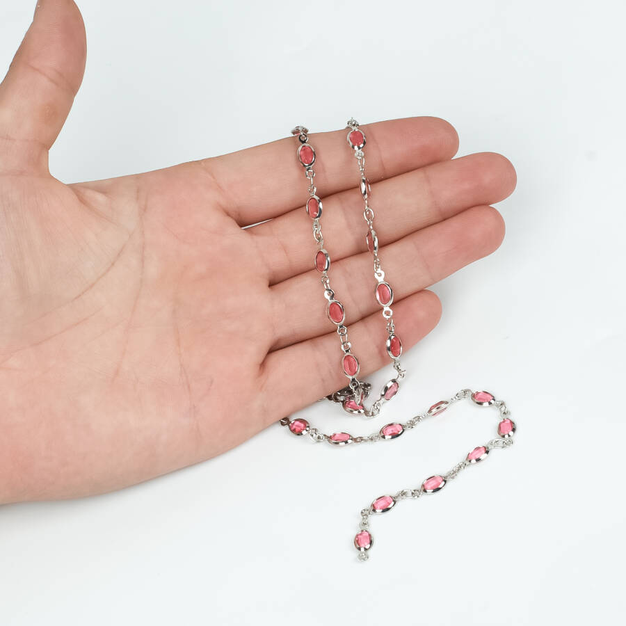 KIRMIZI TAŞLI ZİNCİR, PİRİNÇ MALZEME, RODYUM KAPLAMA