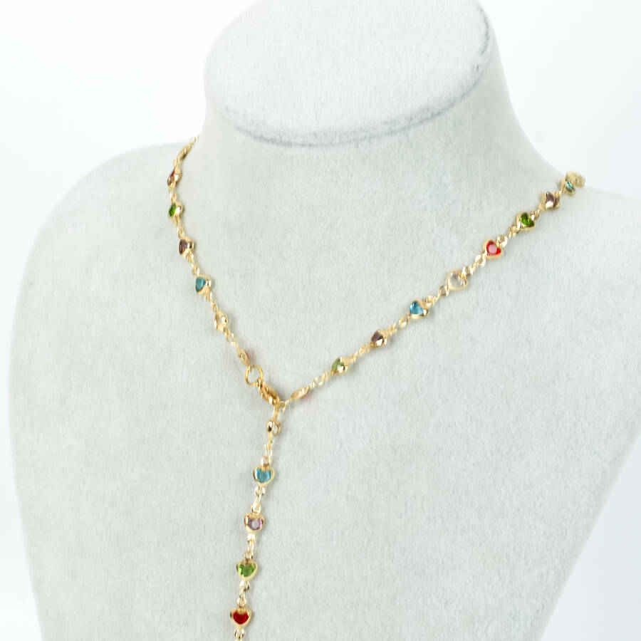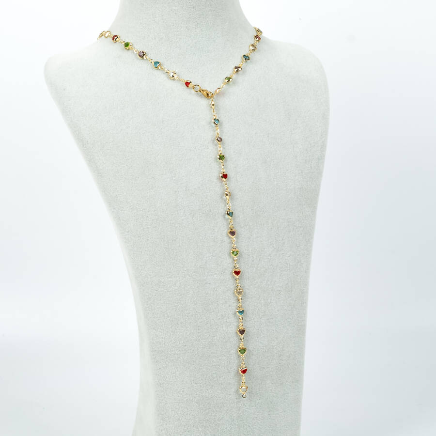 Y KOLYE, KARIŞIK RENK TAŞLI KALP MODEL ZİNCİR, PİRİNÇ MALZEME, ALTIN KAPLAMA