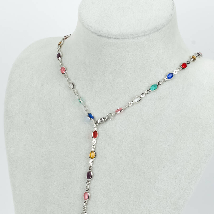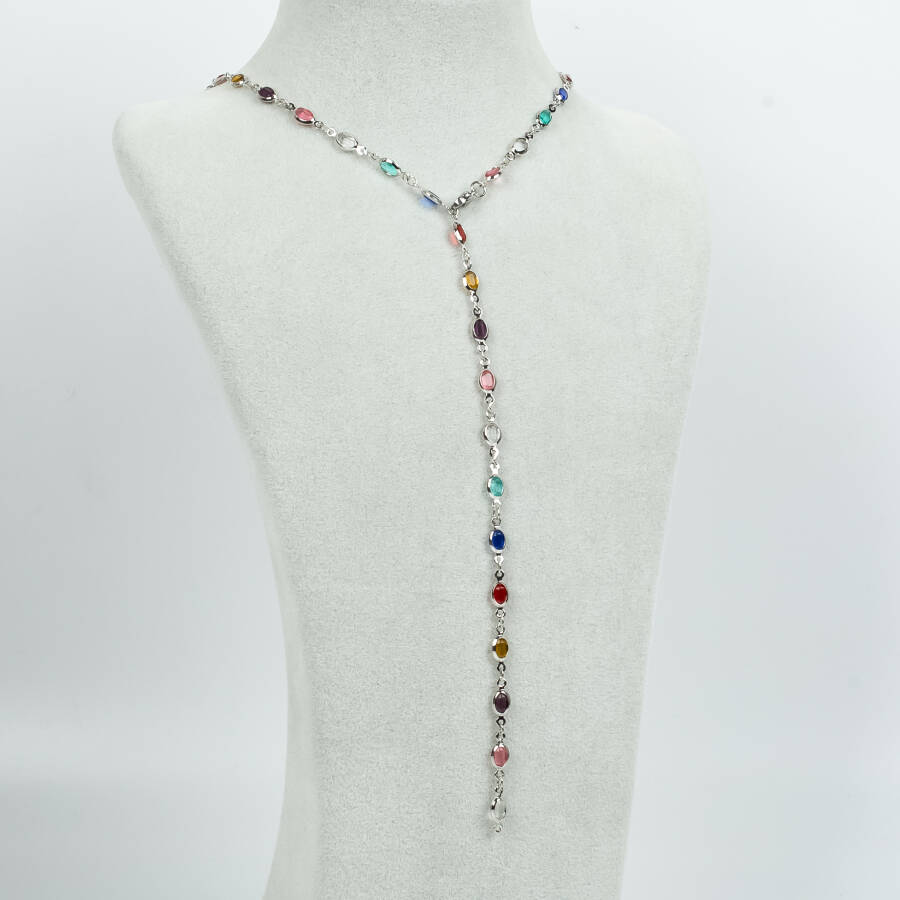 Y KOLYE, KARIŞIK RENK TAŞLI OVAL MODEL ZİNCİR, PİRİNÇ MALZEME, RODYUM KAPLAMA