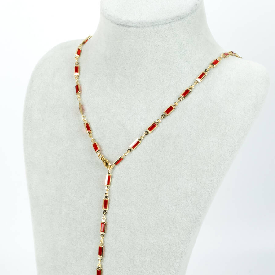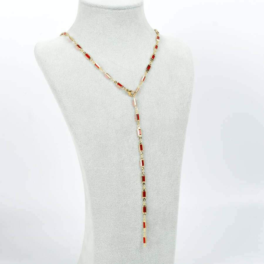Y KOLYE, KIRMIZI TAŞLI DİKDÖRTGEN MODEL ZİNCİR, PİRİNÇ MALZEME, ALTIN KAPLAMA