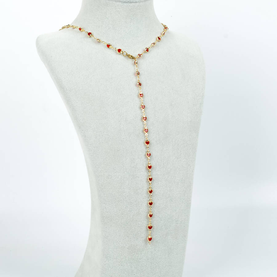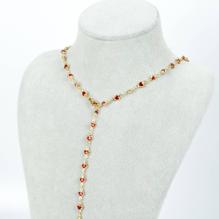 Y KOLYE, KIRMIZI TAŞLI KALP MODEL ZİNCİR, PİRİNÇ MALZEME, ALTIN KAPLAMA