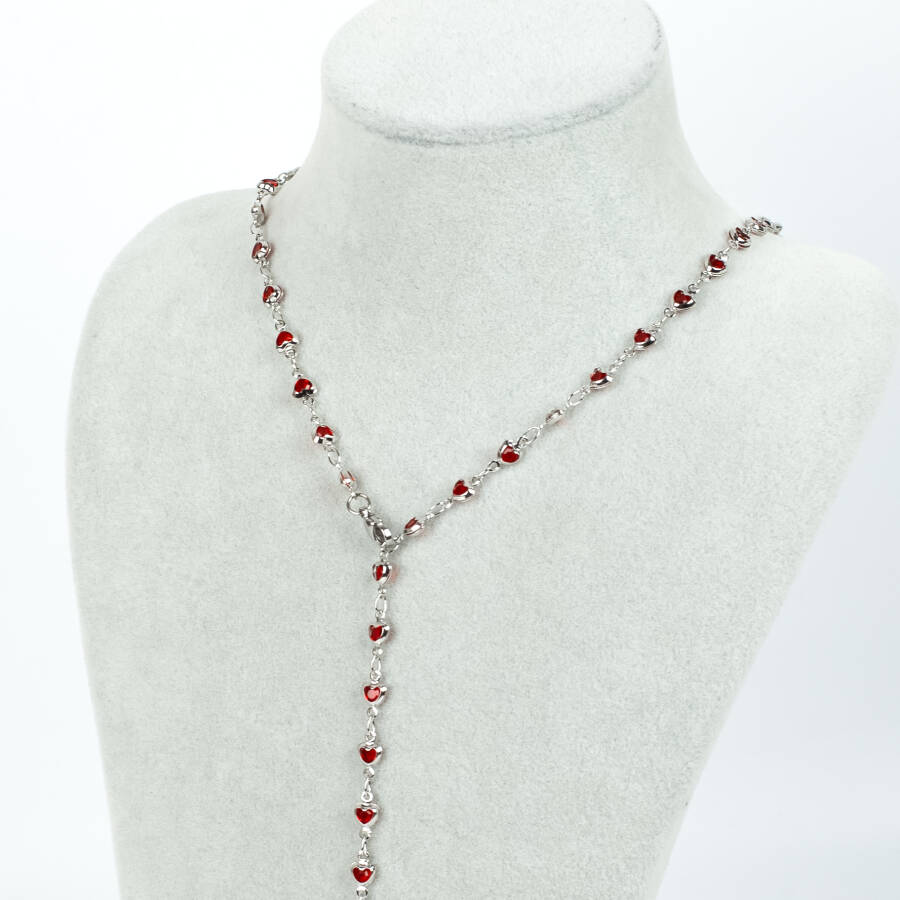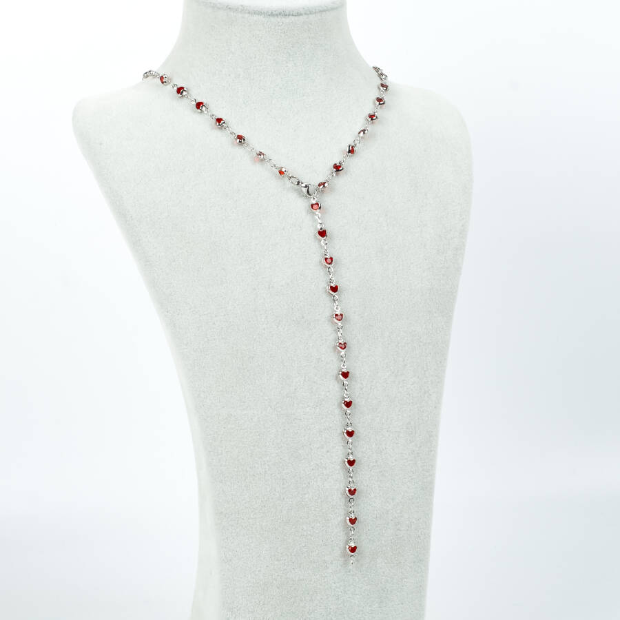Y KOLYE, KIRMIZI TAŞLI KALP MODEL ZİNCİR, PİRİNÇ MALZEME, RODYUM KAPLAMA