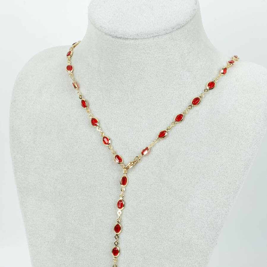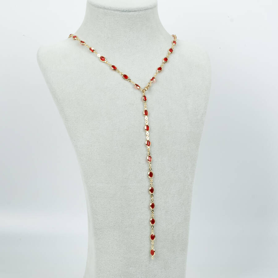 Y KOLYE, KIRMIZI TAŞLI OVAL MODEL ZİNCİR, PİRİNÇ MALZEME, ALTIN KAPLAMA