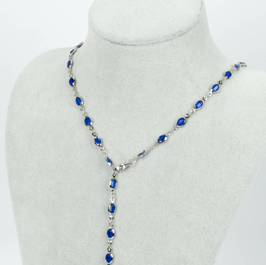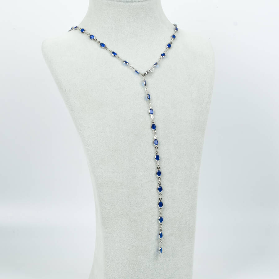 Y KOLYE, MAVİ TAŞLI OVAL MODEL ZİNCİR, PİRİNÇ MALZEME, RODYUM KAPLAMA