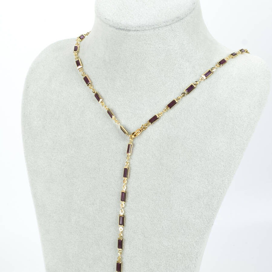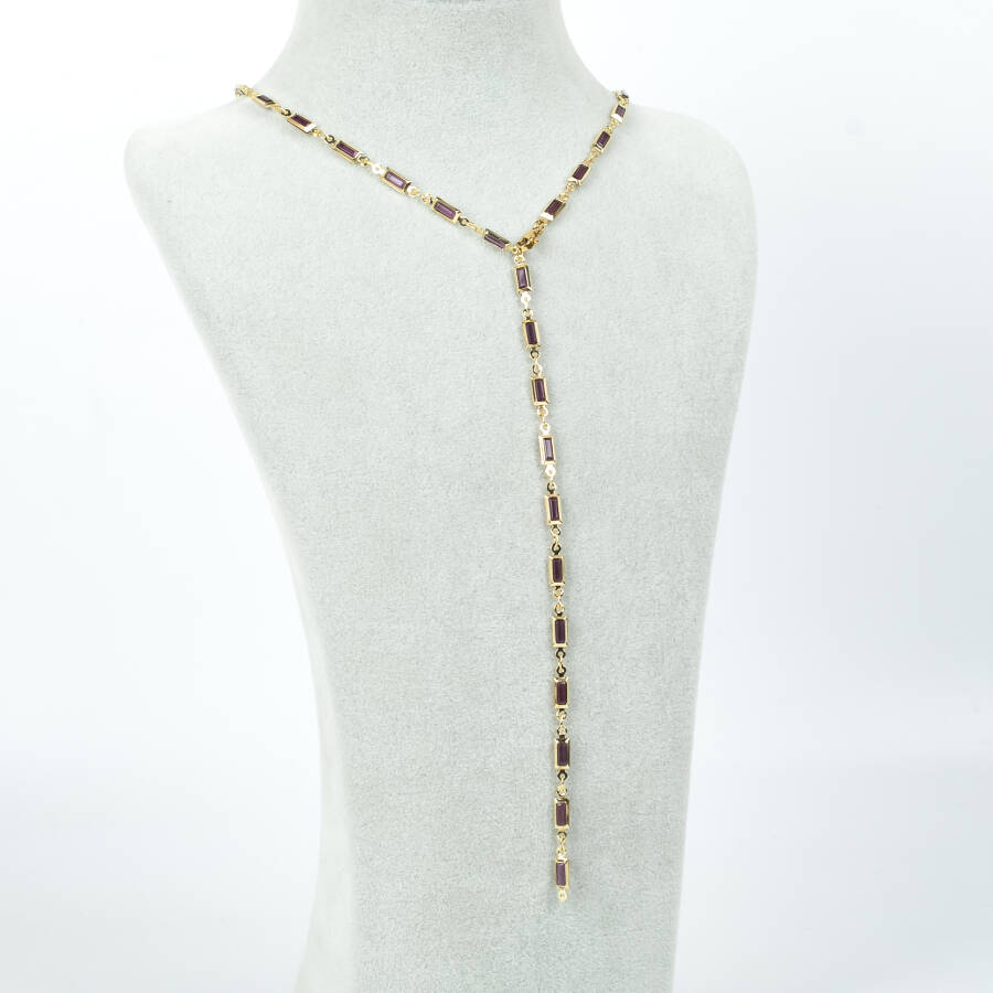 Y KOLYE, MOR TAŞLI DİKDÖRTGEN MODEL ZİNCİR, PİRİNÇ MALZEME, ALTIN KAPLAMA