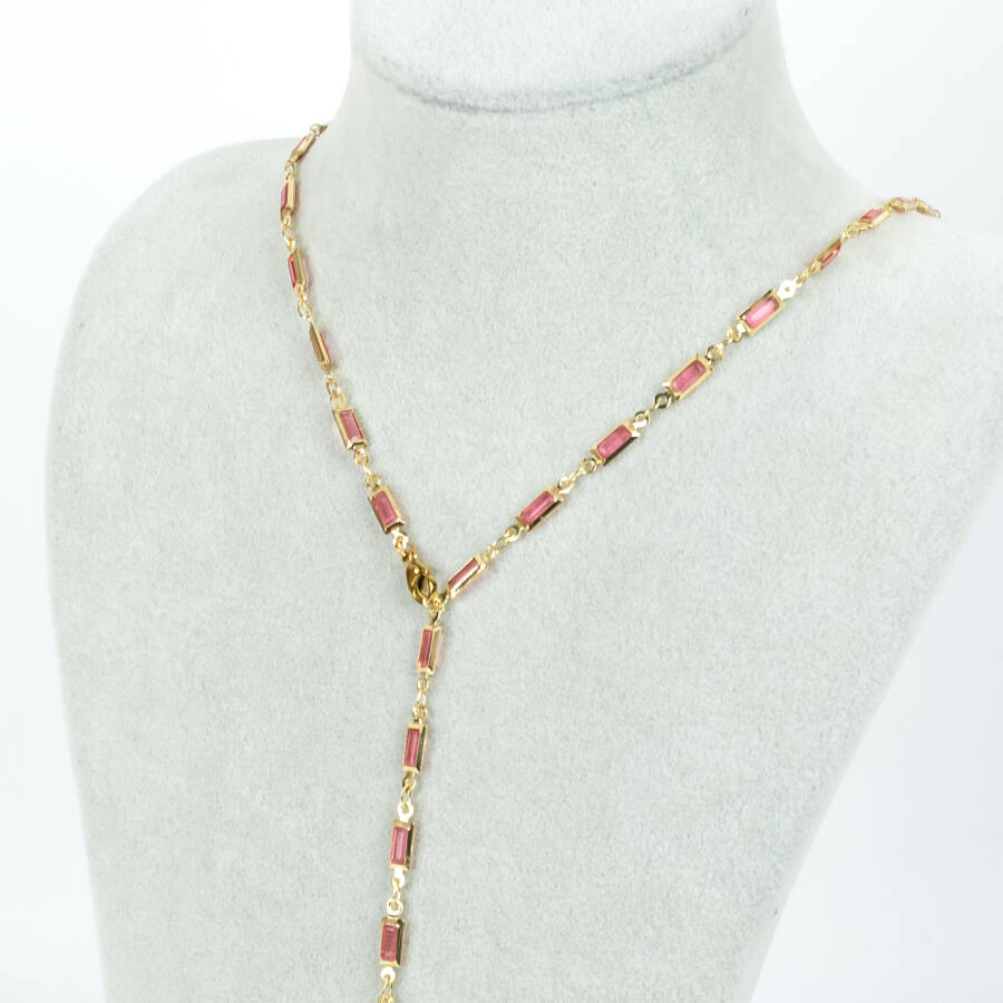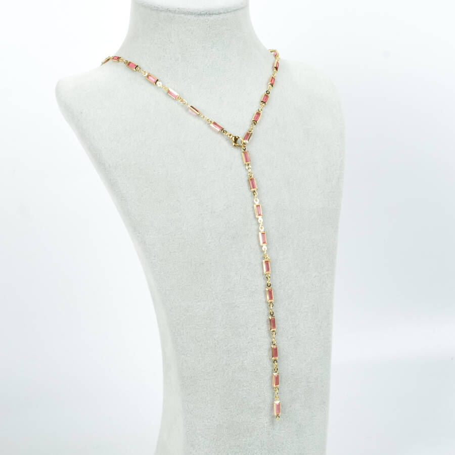 Y KOLYE, PEMBE TAŞLI DİKDÖRTGEN MODEL ZİNCİR, PİRİNÇ MALZEME, ALTIN KAPLAMA