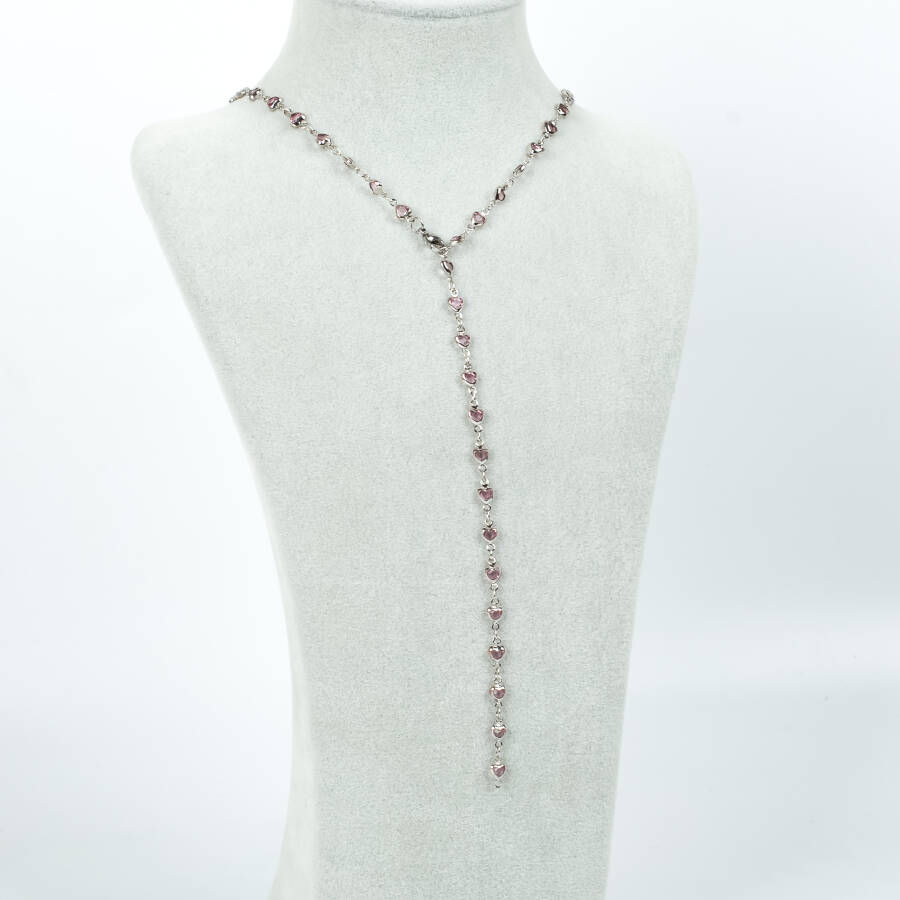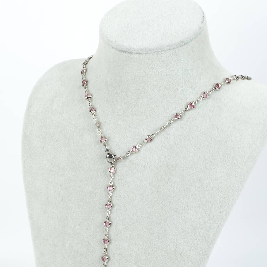 Y KOLYE, PEMBE TAŞLI KALP MODEL ZİNCİR, PİRİNÇ MALZEME, RODYUM KAPLAMA